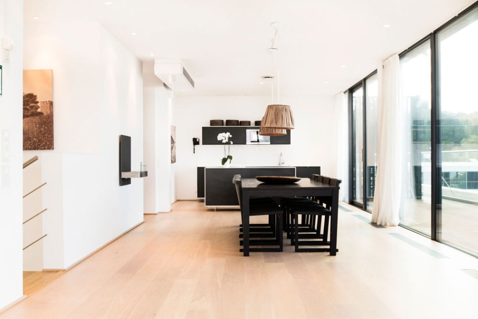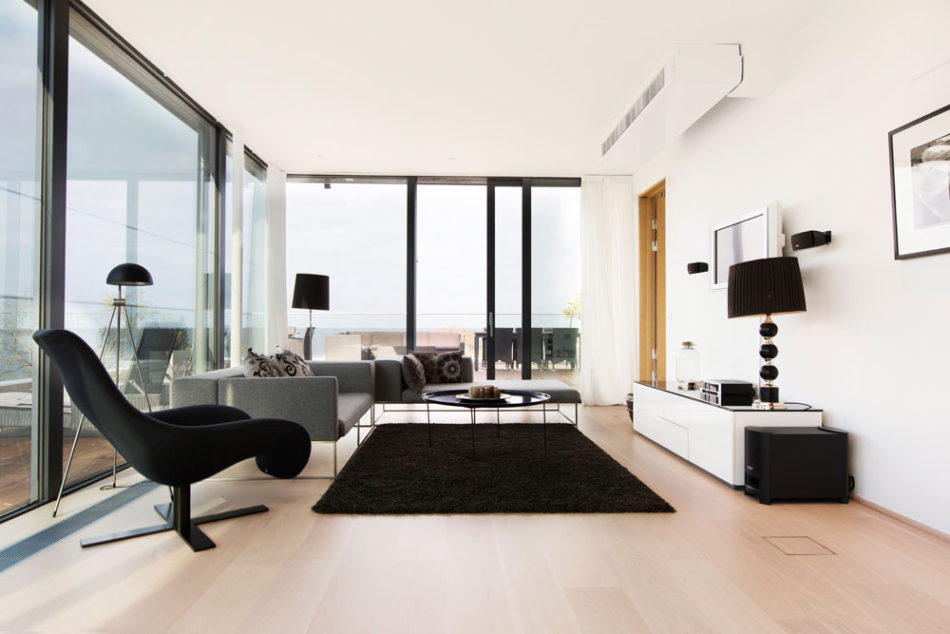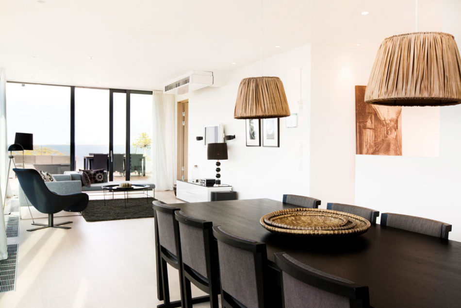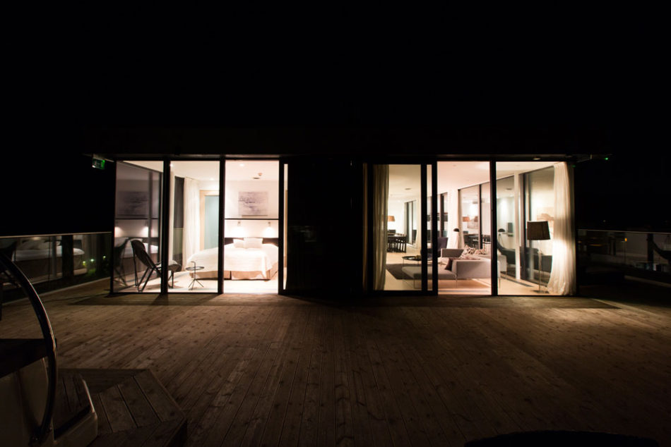 Our largest suite, which comprises 125 square metres, provides luxurious accommodation with two bedrooms with double beds and two bathrooms. The roof terrace has a jacuzzi with a magnificent sea view. The larger living room has a sofa and there is a fully-equipped kitchen. There is a hall on the ground floor and stairs leading up to the suite.