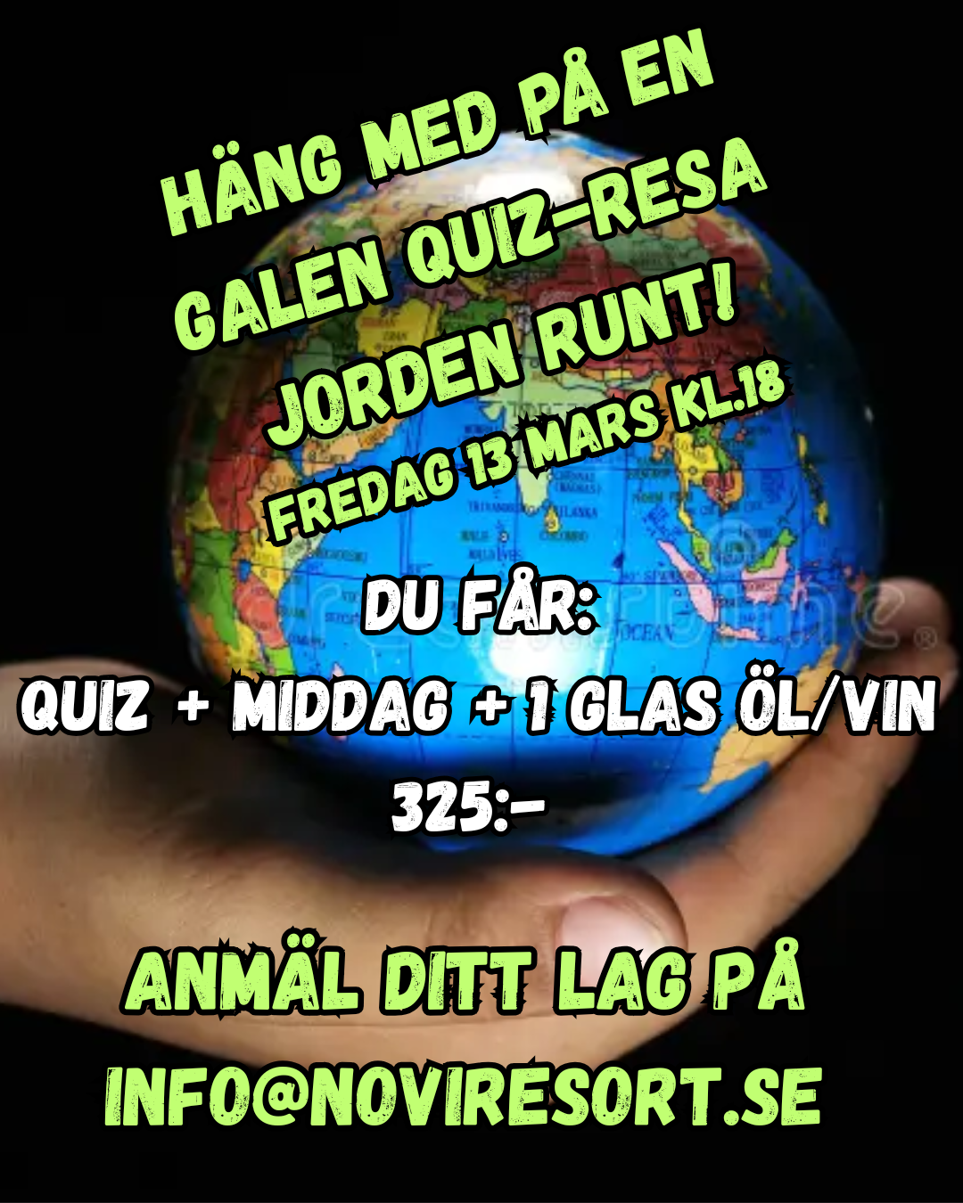 Fredagen den 13 mars kl. 18.00 lyfter vi! NOVI Veranda bjuder in till ett episk Jorden Runt-Quiz som tar er med på en vindlande resa genom musik, arkitektur, flaggor och allt däremellan.